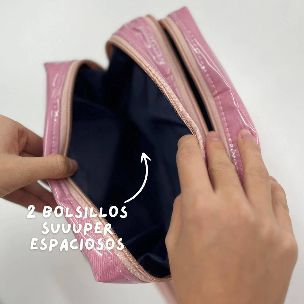 Es un neceser muy fachero, pero que además, cuenta con dos divisones principales y una mas chica en el frente, también cuenta con un compartimiento lateral con dos bolsillos dentro para que puedas separar bien todo y que esté protegido (por si llevas documentos o cosas importantes).